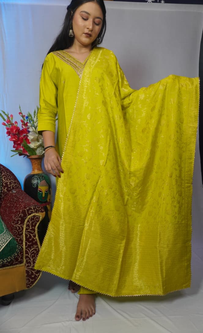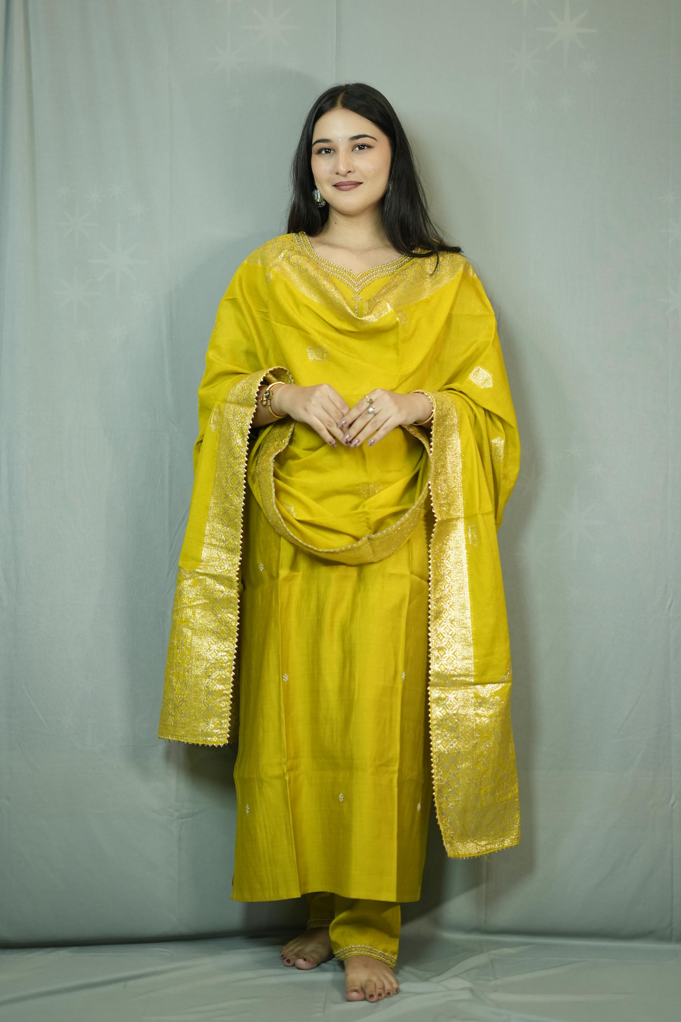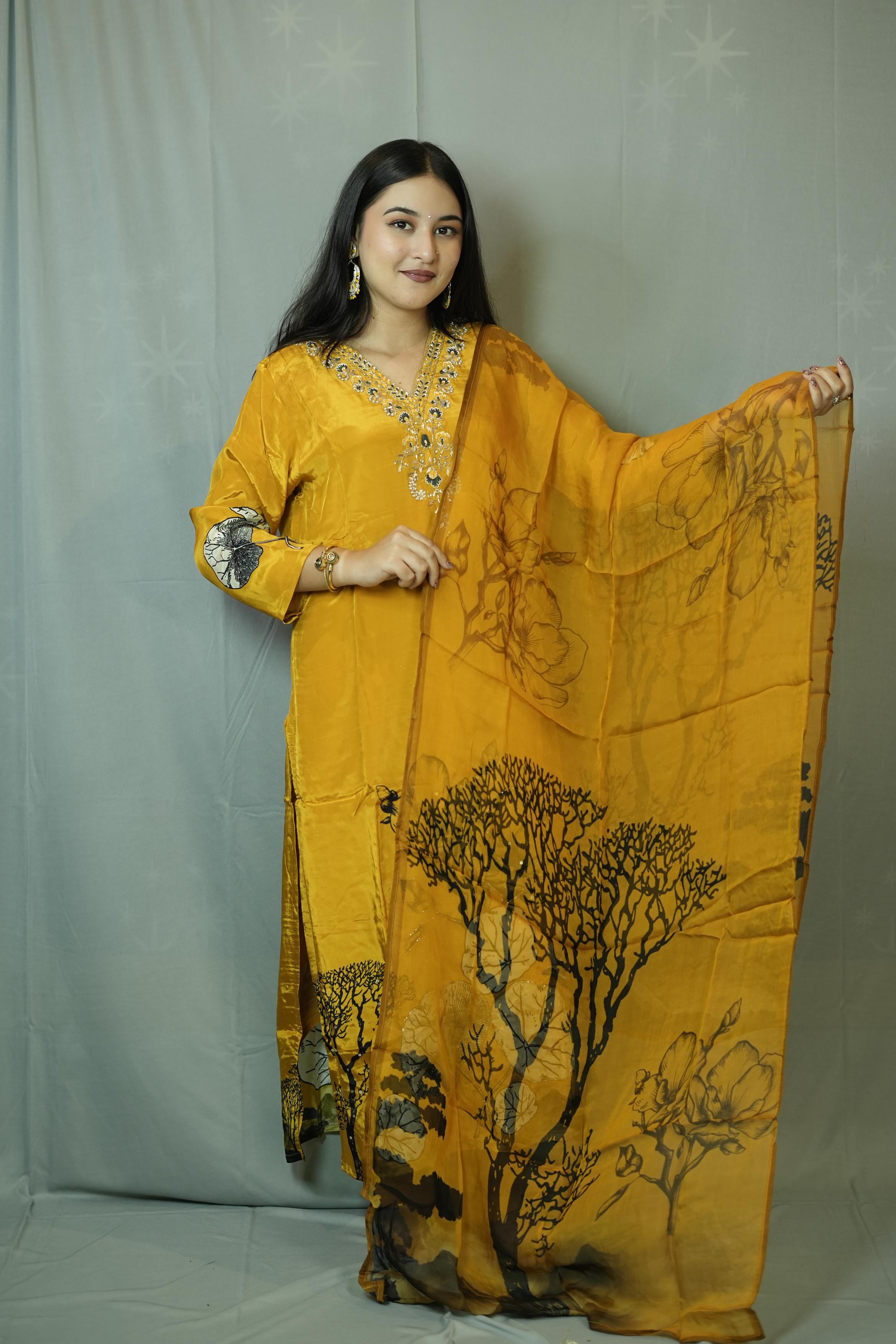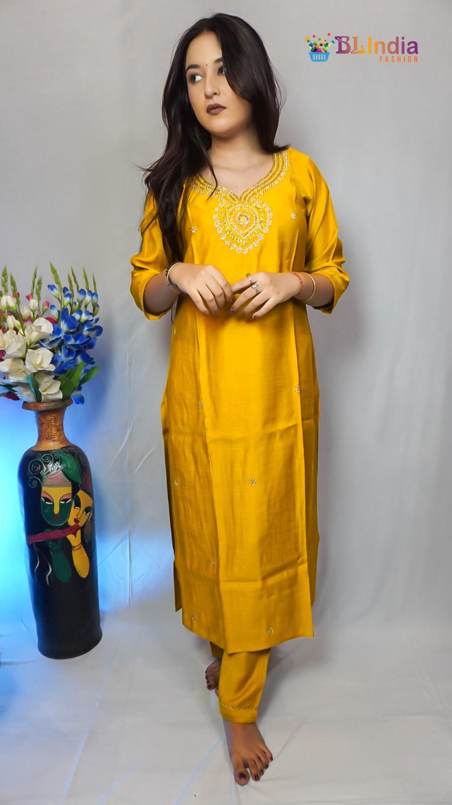 Yellow Embroidered Kur...
