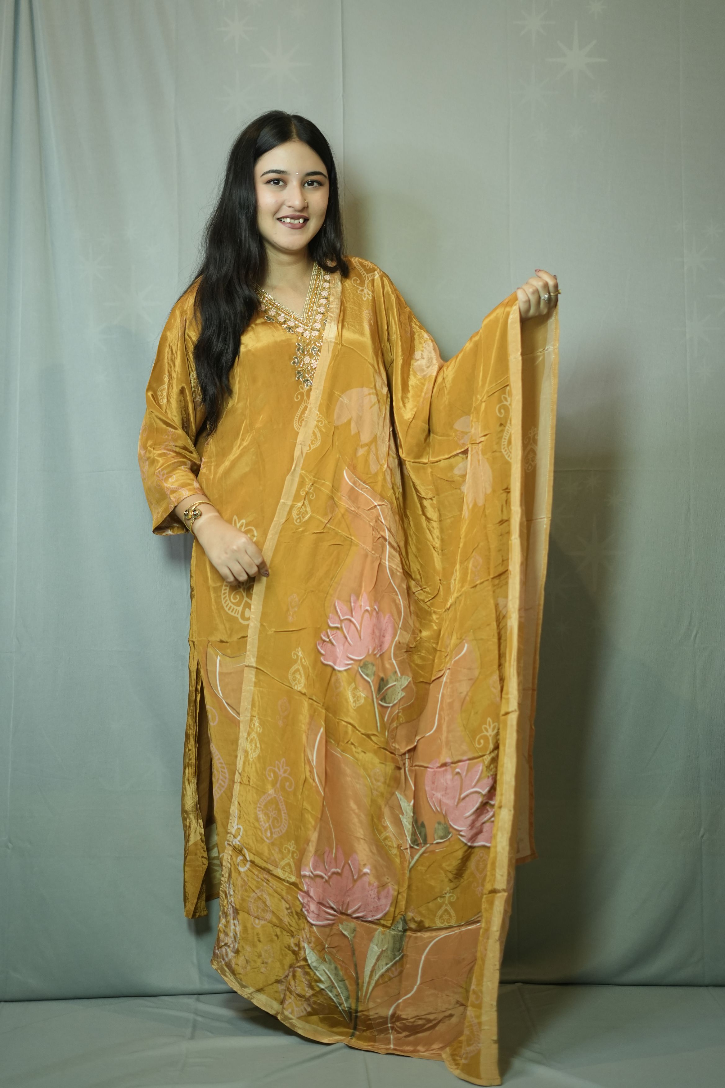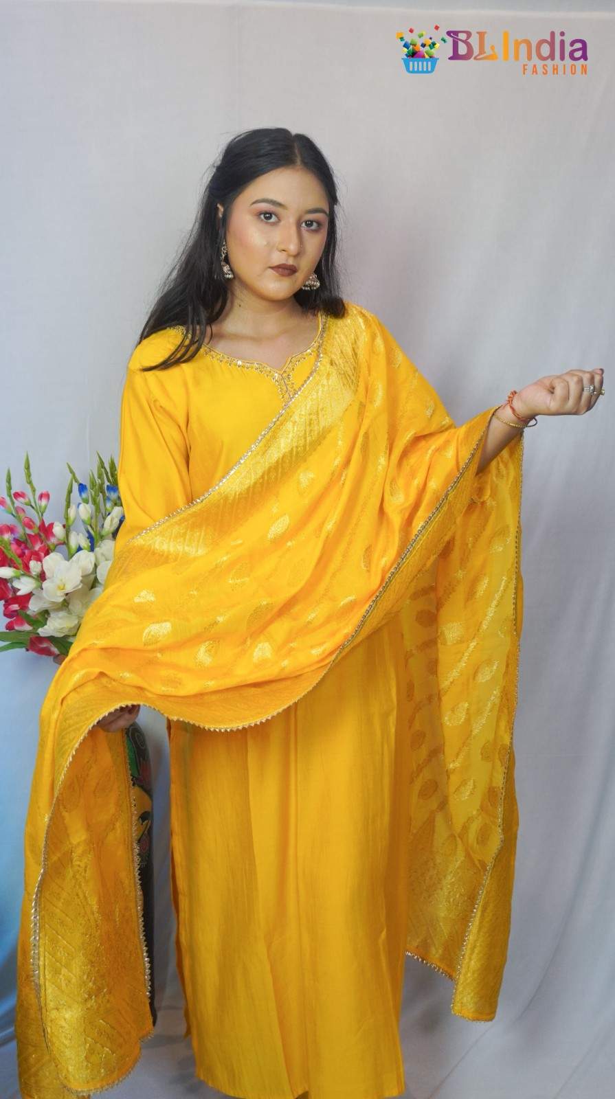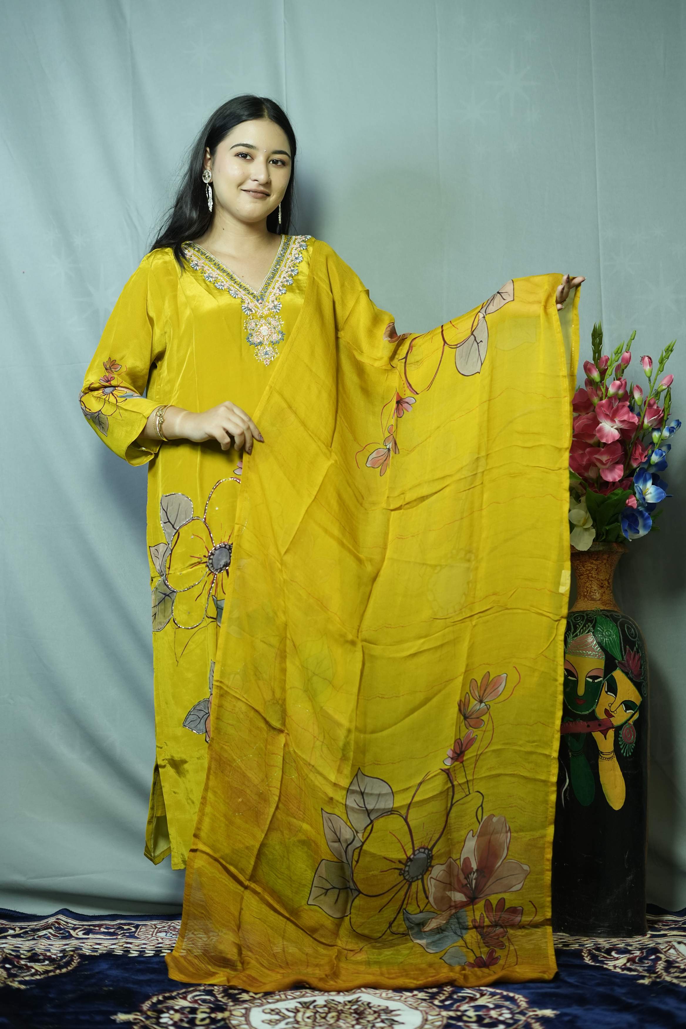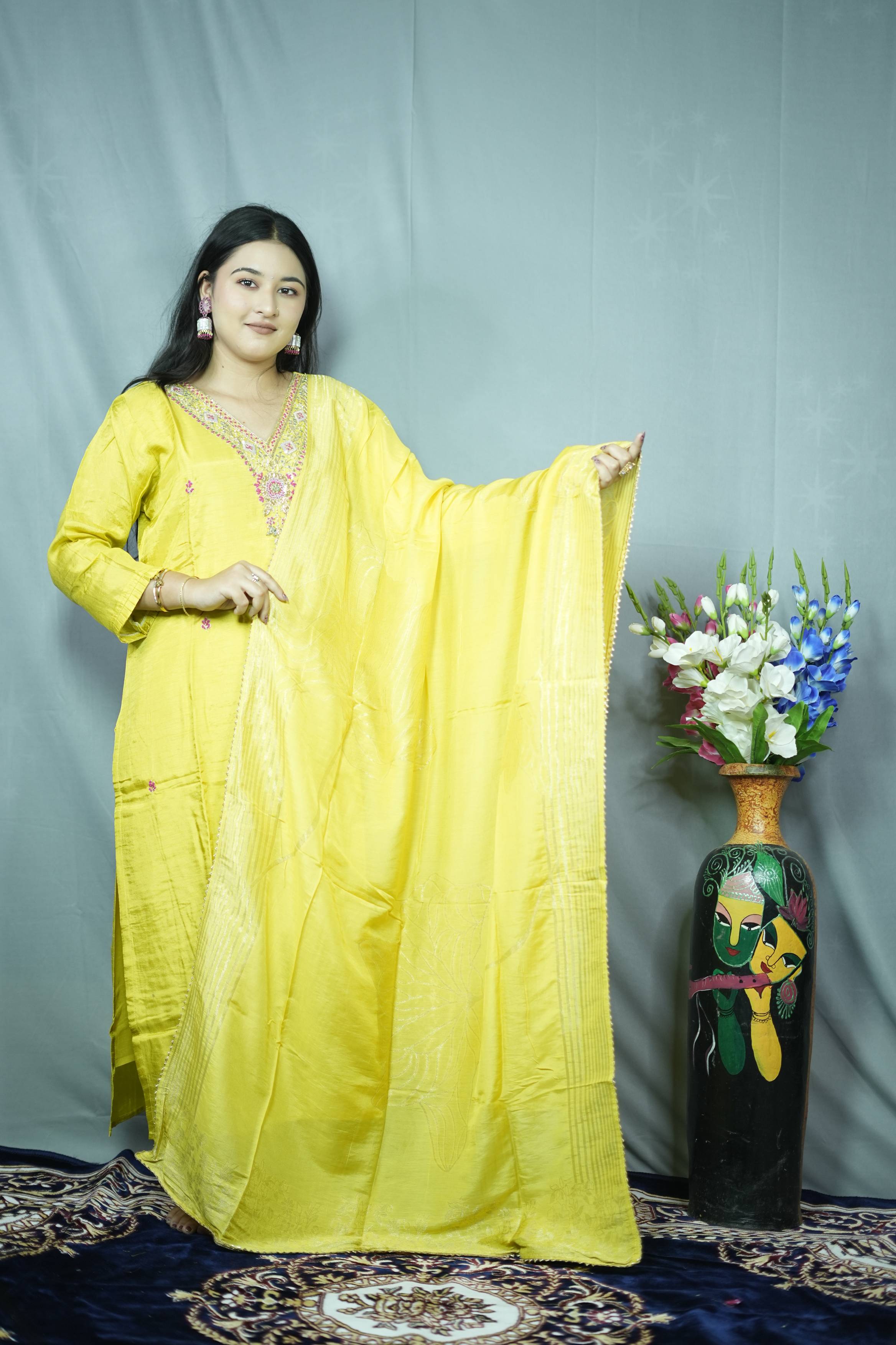 Yellow Embroidered Kur...