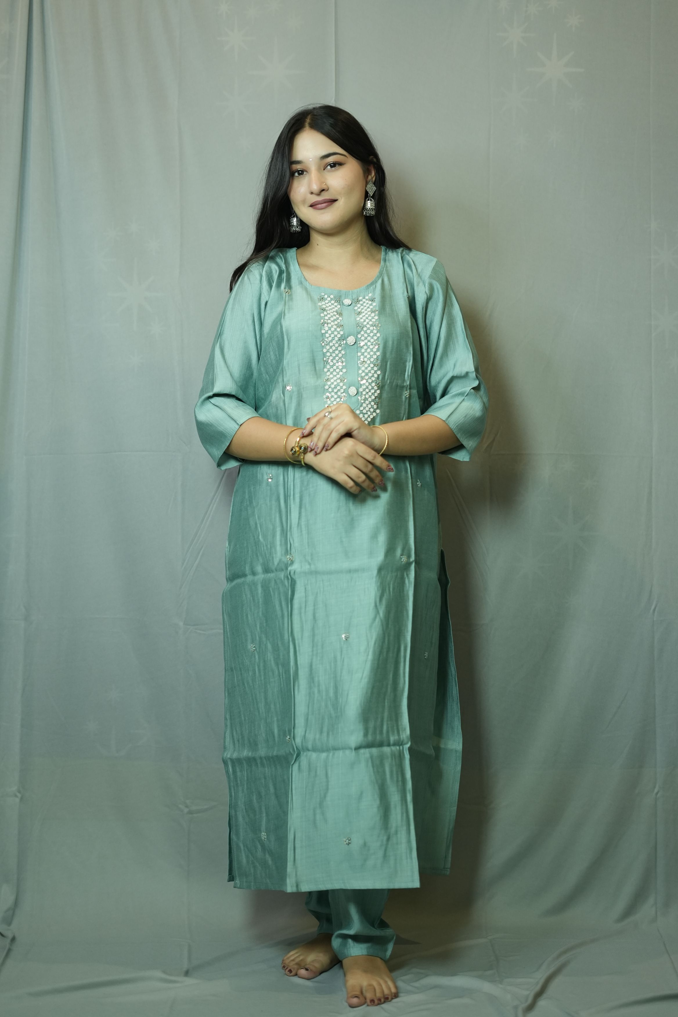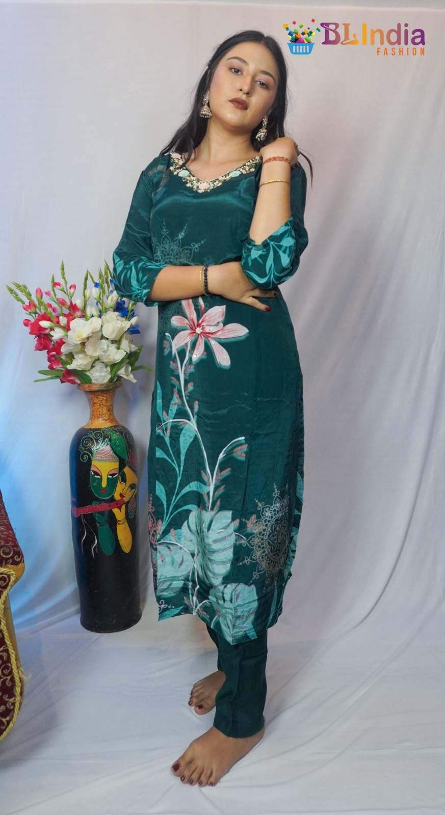 Teal V-Neck Kurti Set wit...