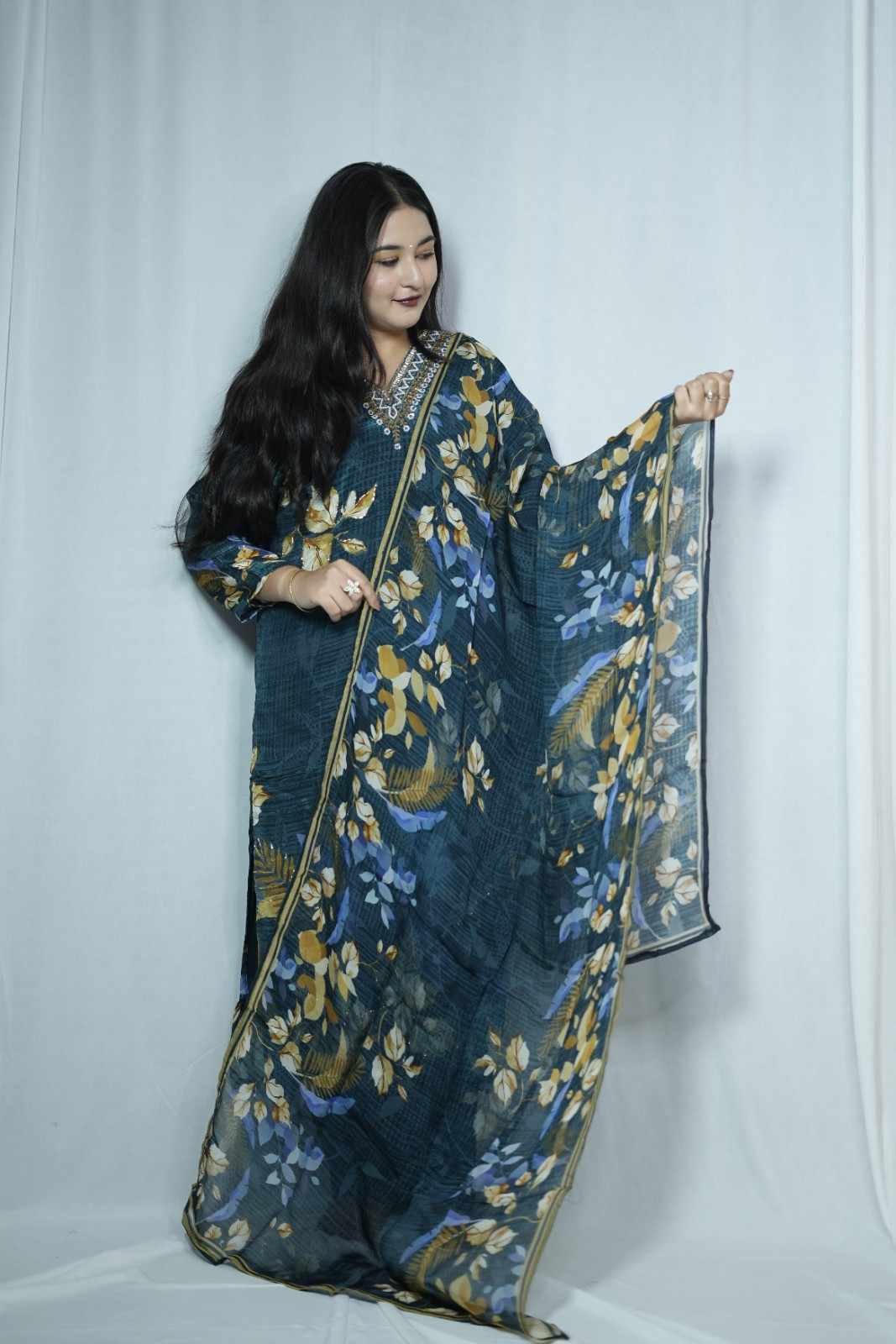 Teal Crape Kurti Set with...